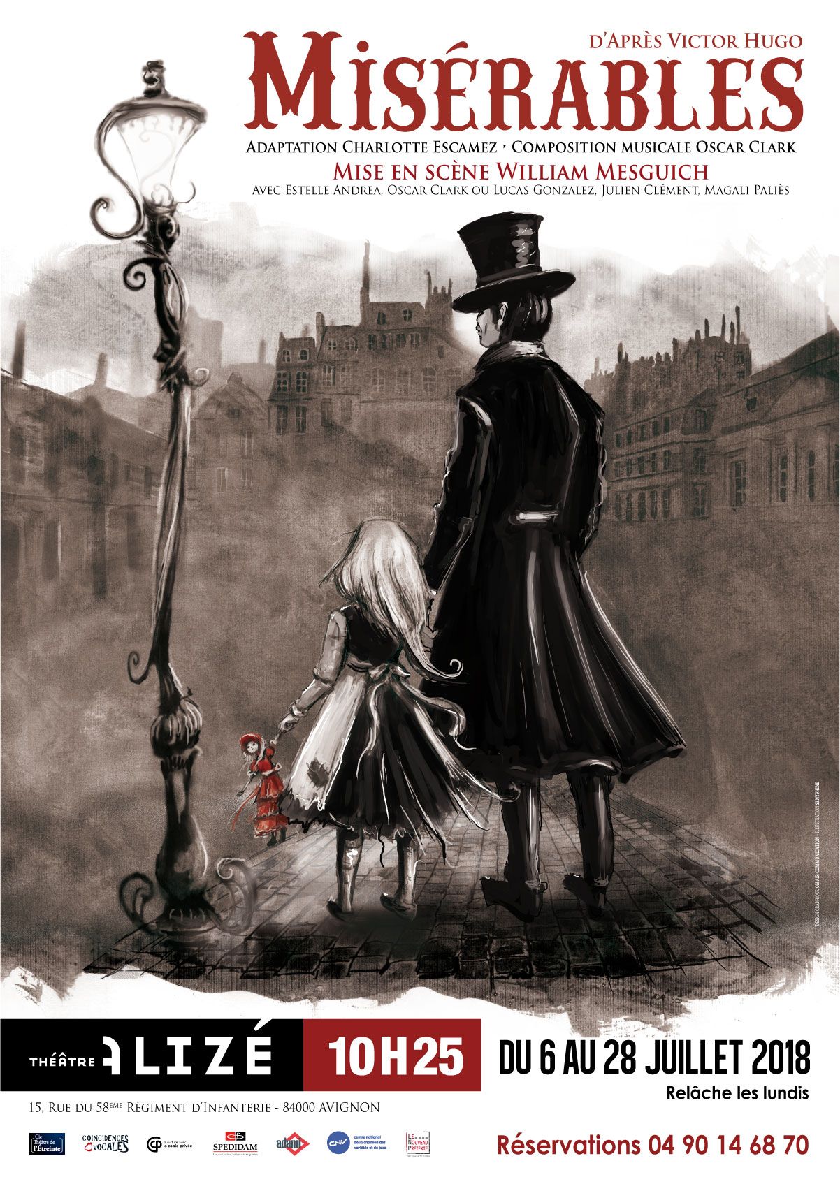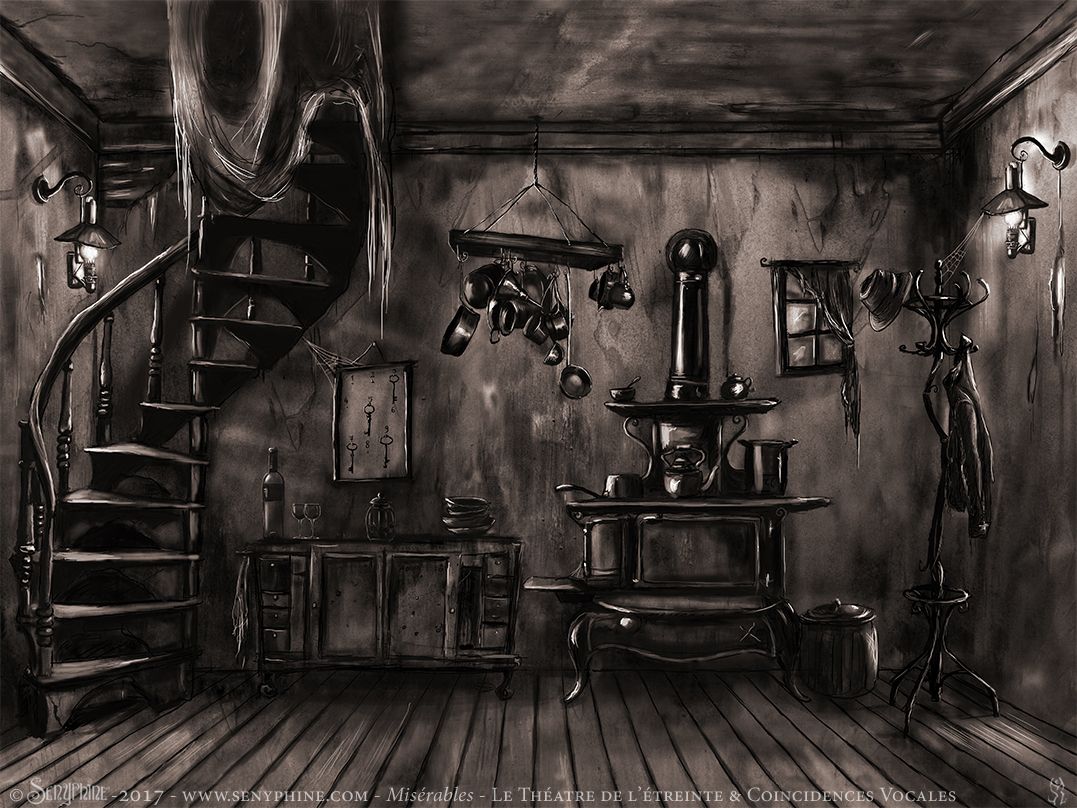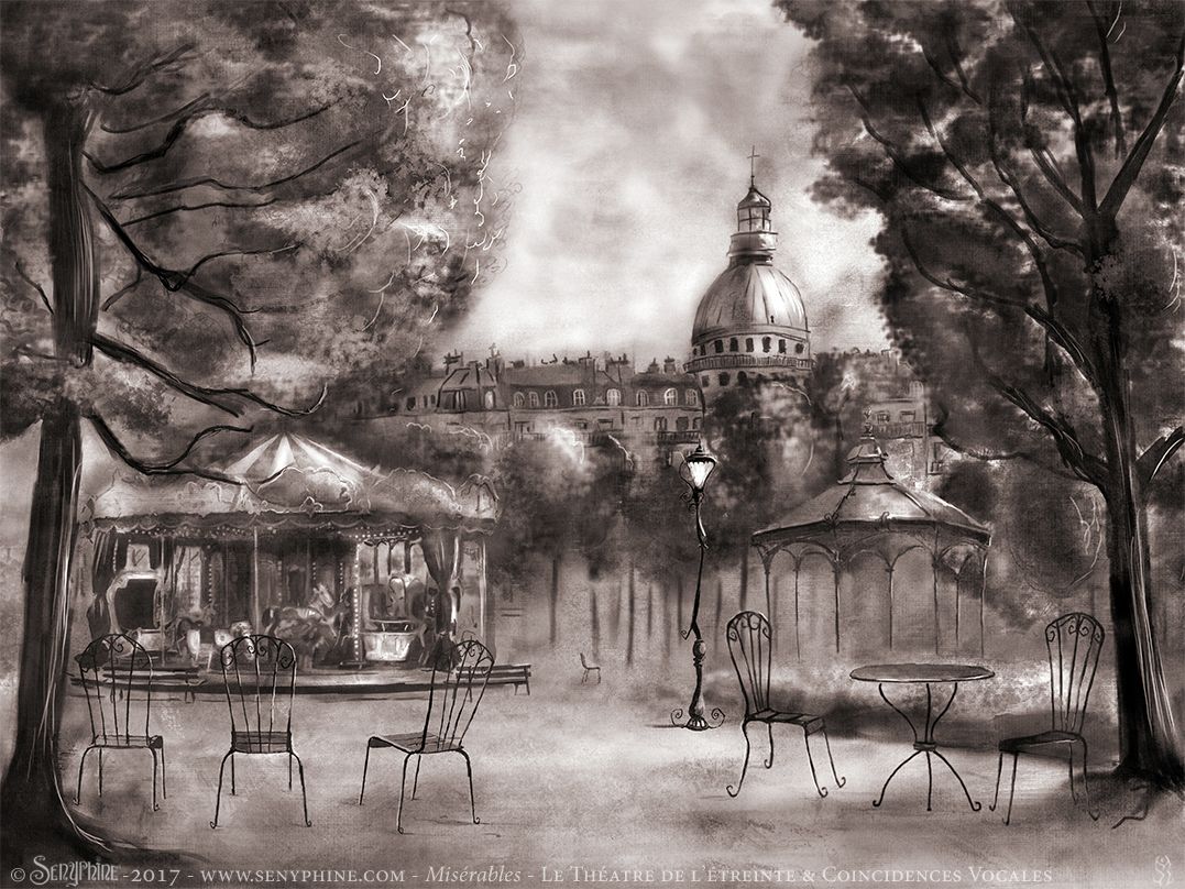 Illustrations réalisées pour l'affiche et les décors de scène du spectacle Misérables produit par le Théâtre de L’Étreinte & par la Compagnie Coincidences Vocales. Spectacle musical joué lors du Festival d'Avignon 2018 et sur Paris. Adaption du texte de Victor Hugo par Charlotte Escamez. Mise en scène de William Mesguich.