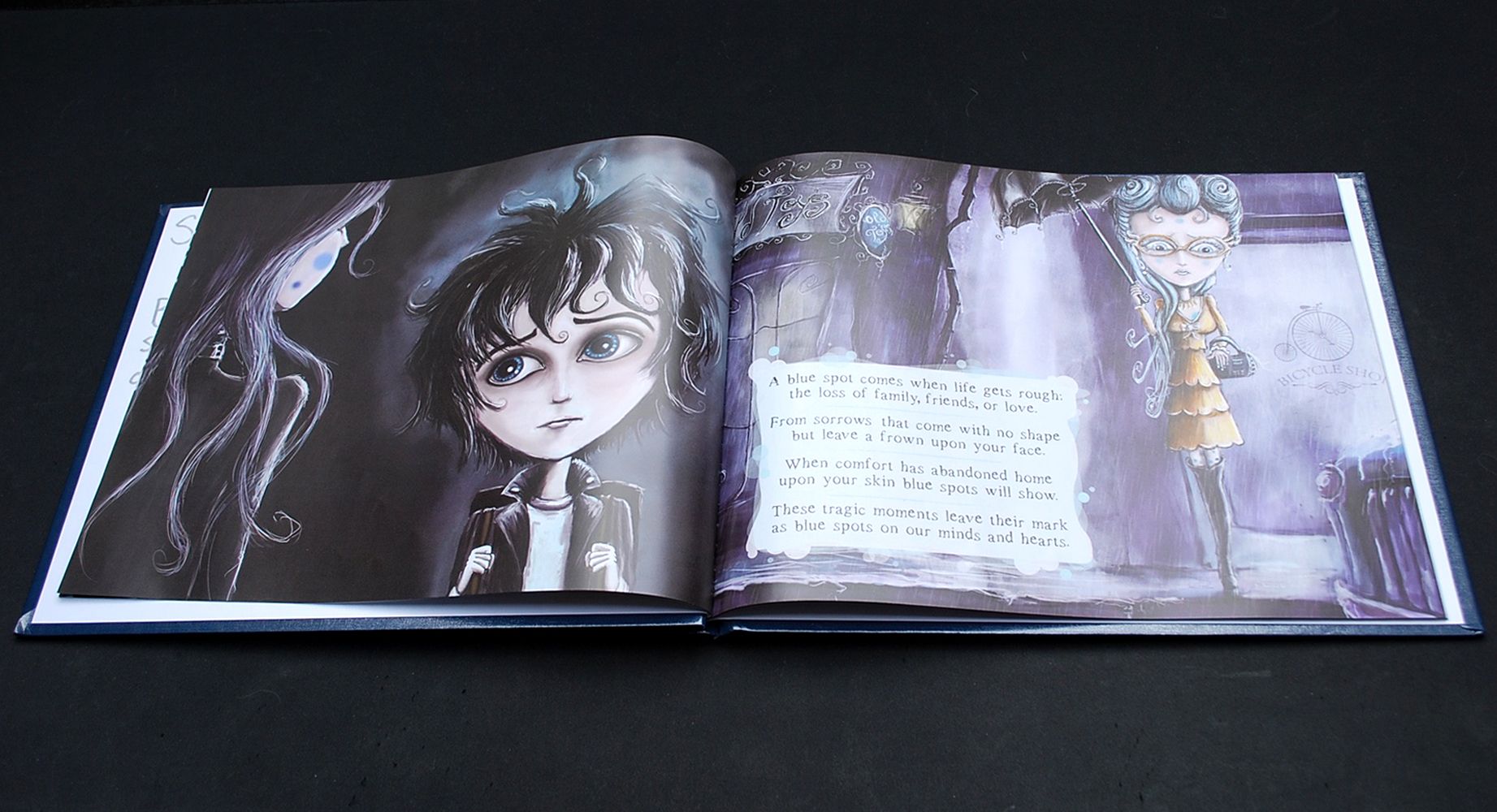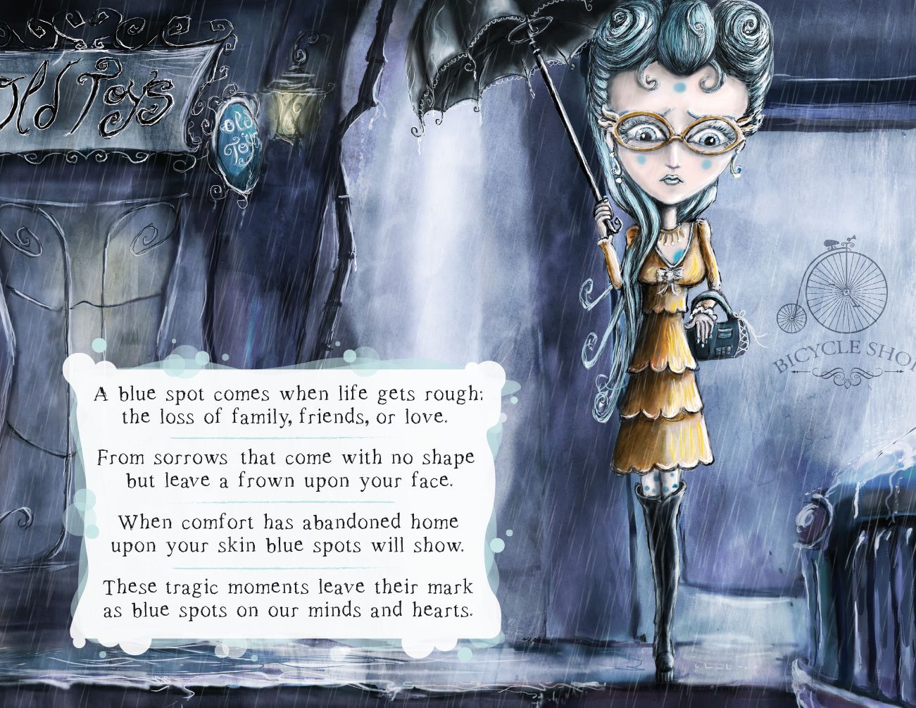 Résumé : Cette histoire parle des gens qui sont accablés par la tristesse. L'histoire se déroule dans une ville où les cicatrices émotionnelles apparaissent sous forme de pois bleus sur les habitants. Dans la réalité, la tristesse n'est pas visibles aux yeux des autres; ici les pois symbolisent toutes les peines qu'une personne rencontre dans sa vie. L'auteure à écrit ce livre pour donner de l'espoir dans des temps difficiles et le courage d'avancer vers des jours plus heureux et d'en ressortir plus fort.