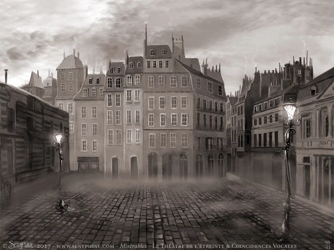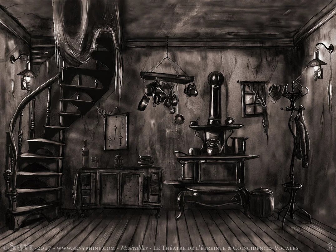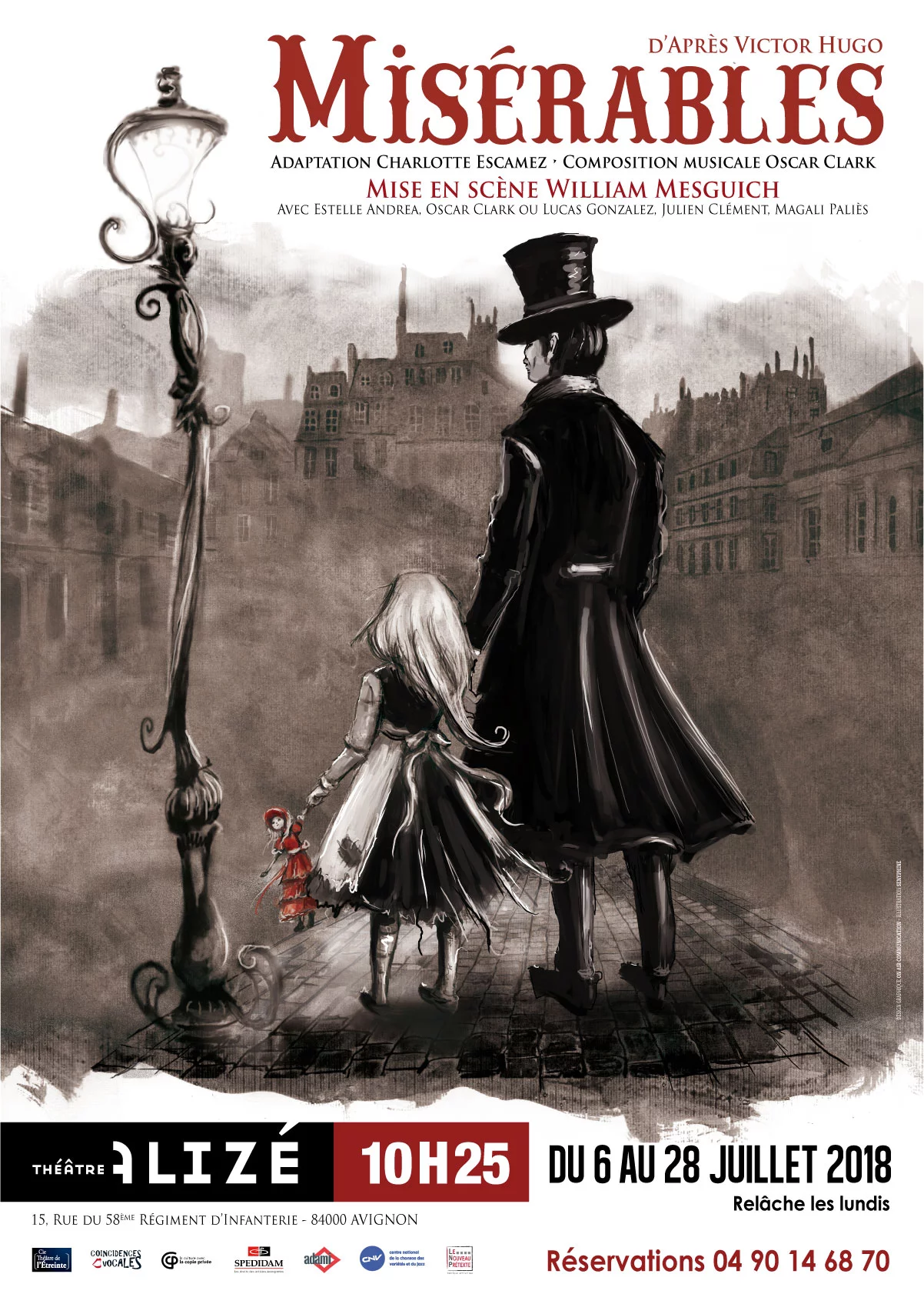 Illustrations réalisées pour l'affiche et les décors de scène du spectacle  Misérables produit par le Théâtre de L’Étreinte & par la Compagnie Coincidences Vocales. Spectacle musical joué lors du Festival d'Avignon 2018 et sur Paris. Adaption du texte de Victor Hugo par Charlotte Escamez. Mise en scène de William Mesguich