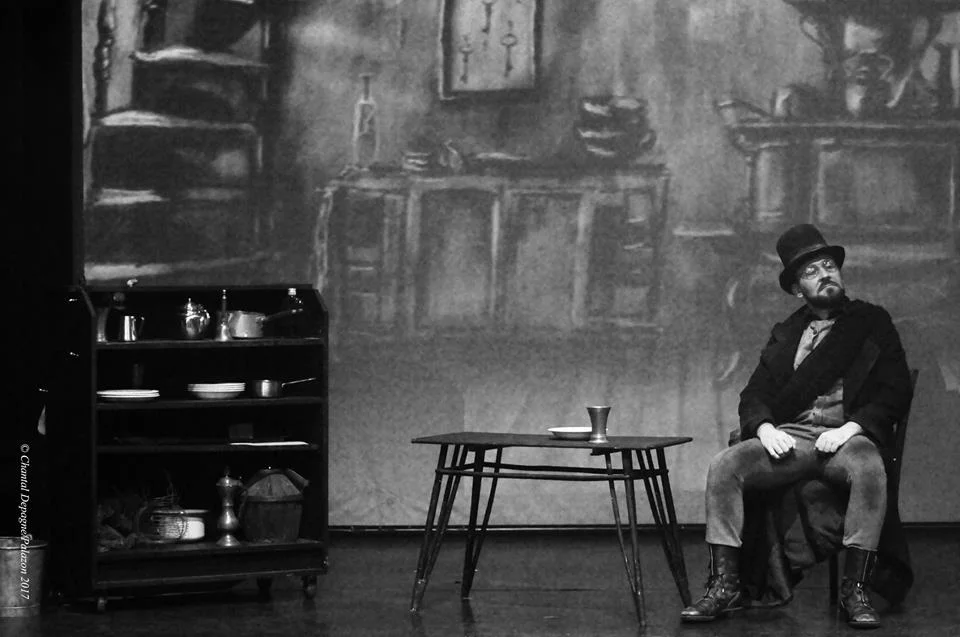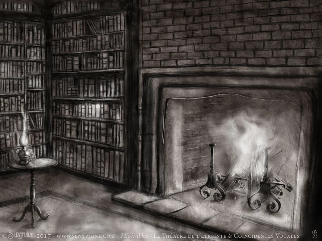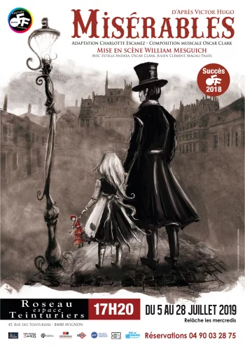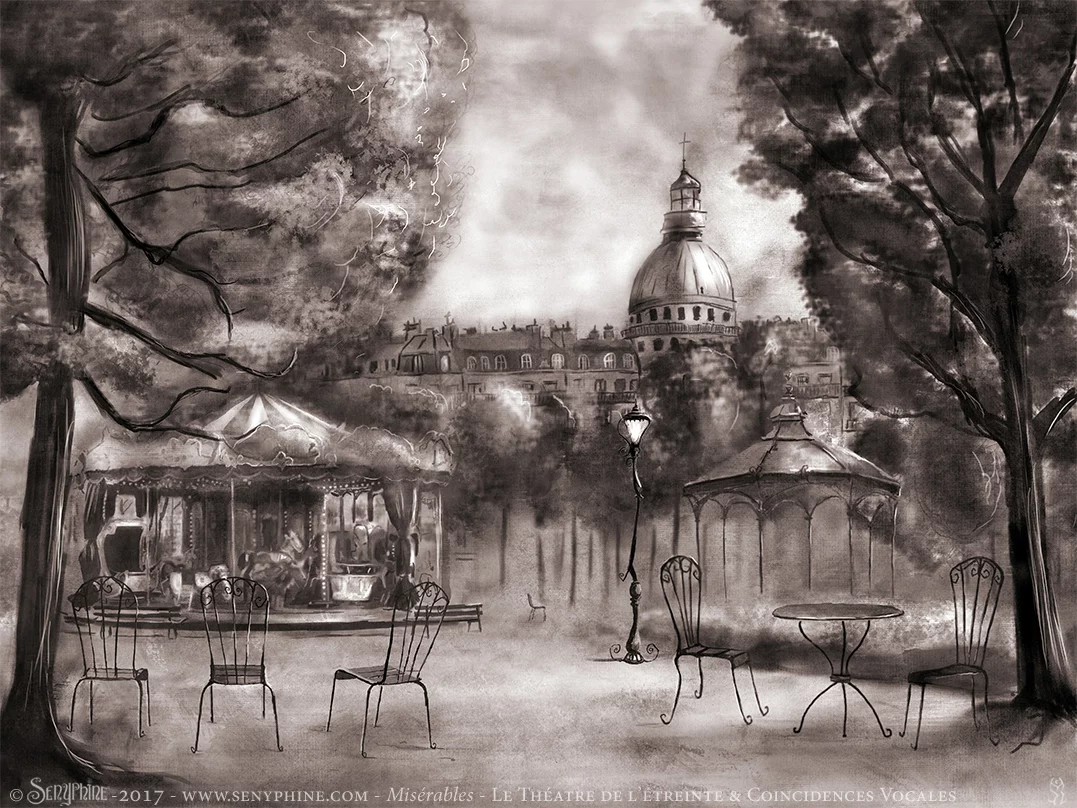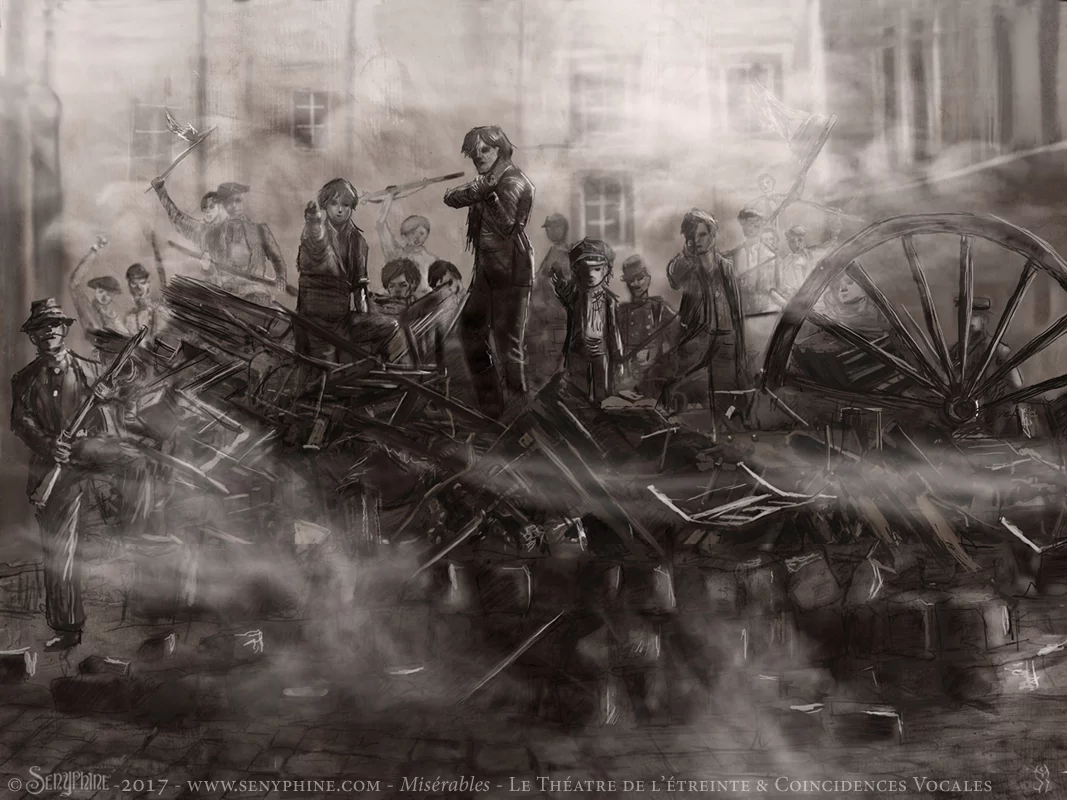 Illustrations réalisées pour l'affiche et les décors de scène du spectacle  Misérables produit par le Théâtre de L’Étreinte & par la Compagnie Coincidences Vocales. Spectacle musical joué lors du Festival d'Avignon 2018 et sur Paris. Adaption du texte de Victor Hugo par Charlotte Escamez. Mise en scène de William Mesguich
