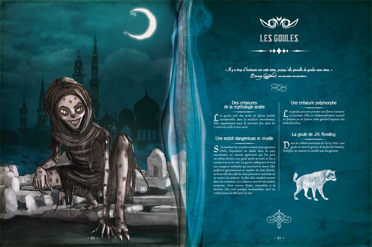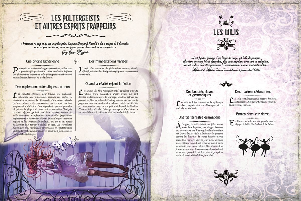 RESUME : « Quelle idée d’avoir fait une séance de spiritisme ! À présent, tout vole dans la pièce : les esprits frappeurs sont à la fête. Une belle revenante vous tend la main. Vous êtes sur le point d’entrer dans la danse... Mais quelqu’un hurle dans le jardin : c’est peut-être une banshee, sous le clair de lune ? À moins que ce ne soit le dîner d’un vampire qui se rebiffe. Chasser les humains, ce n’est pas de tout repos pour les créatures de la nuit. Cela vous fait penser que lorsque vous rentrerez, il vous faudra contourner le cimetière : une charmante goule y réside. Et elle a faim... De nombreuses créatures du monde entier sont revenues de l’Au-delà pour hanter cette encyclopédie. De quoi frissonner à tout âge ! »