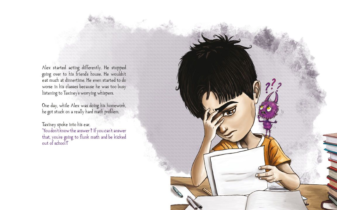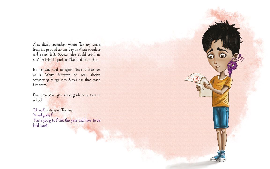 Résumé : Alex était un enfant comme les autres, à l'exception du petit monstre qui le suivait partout et qui lui chuchotait ses inquiétudes à l'oreille. Alex essayait de ne pas écouter le Monstre de l'Inquiétude mais au bout d'un moment cela devint difficile de l'ignorer. Les inquiétudes d'Alex grandissaient jours après jours, puis il se mit à chercher des réponses à ses questions pour ne plus être inquiet et il finit même par découvrir qu'il avait le pouvoir de les maitriser. Bien que ce livre ait été écrit pour les enfants, le message s'adresse à tout le monde. Il est important pour chacun non seulement de comprendre ce qu'est réellement l'anxiété mais surtout comment apprendre à vivre avec elle.