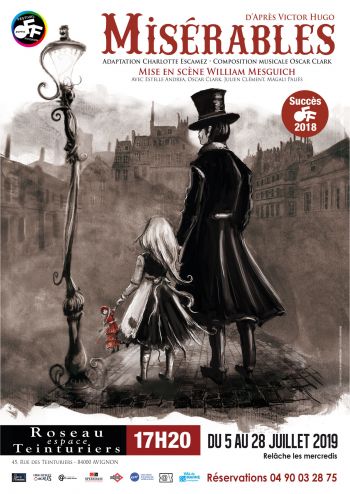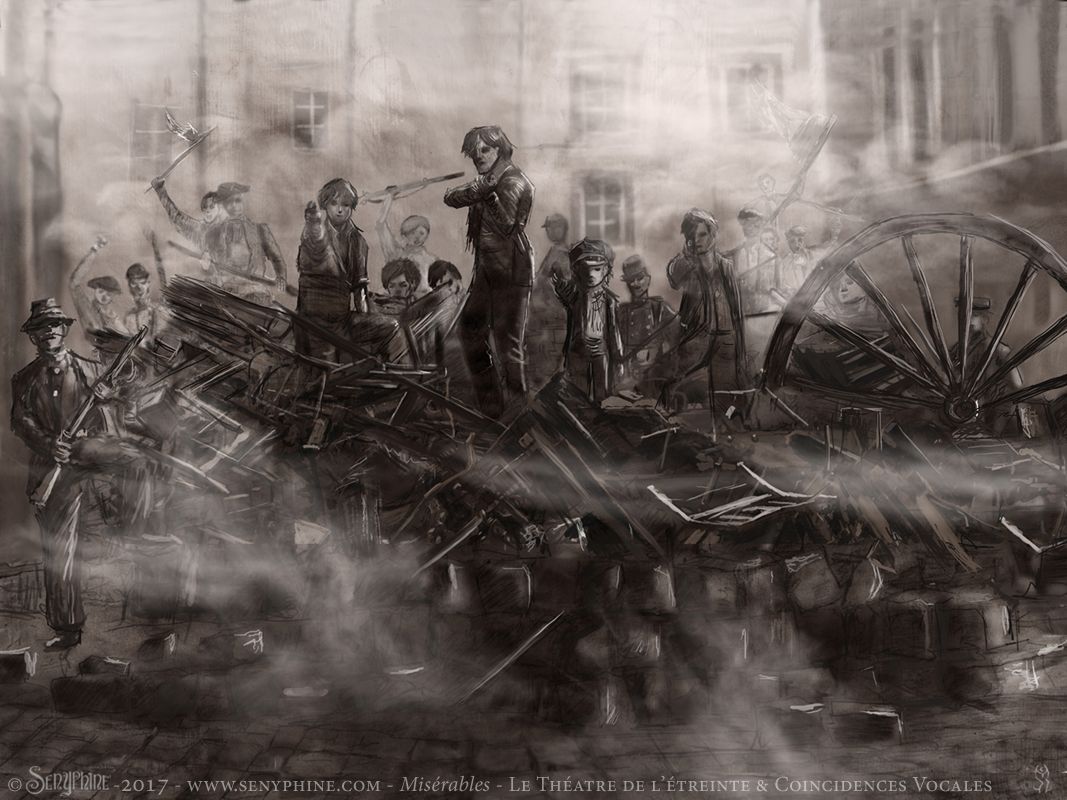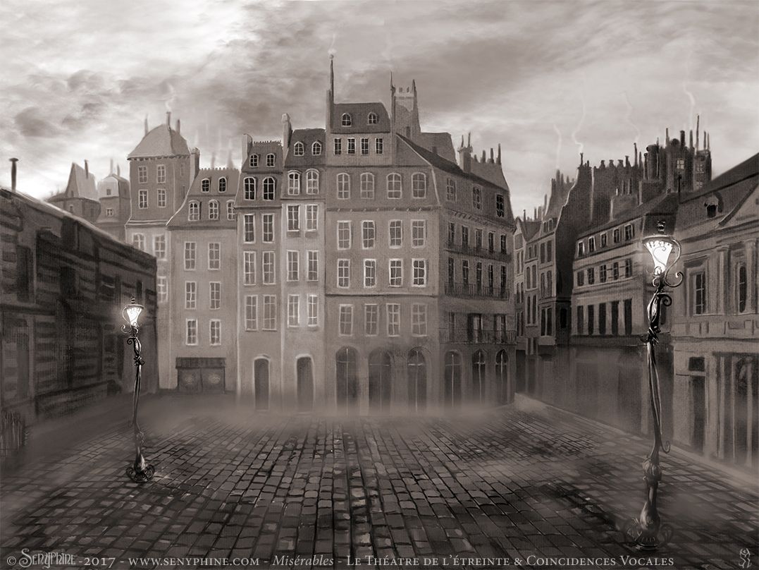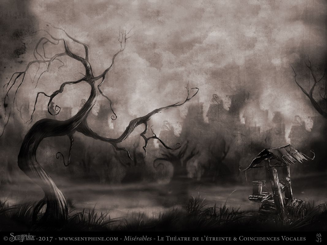 Illustrations réalisées pour l'affiche et les décors de scène du spectacle Misérables produit par le Théâtre de L’Étreinte & par la Compagnie Coincidences Vocales. Spectacle musical joué lors du Festival d'Avignon 2018 et sur Paris. Adaption du texte de Victor Hugo par Charlotte Escamez. Mise en scène de William Mesguich.