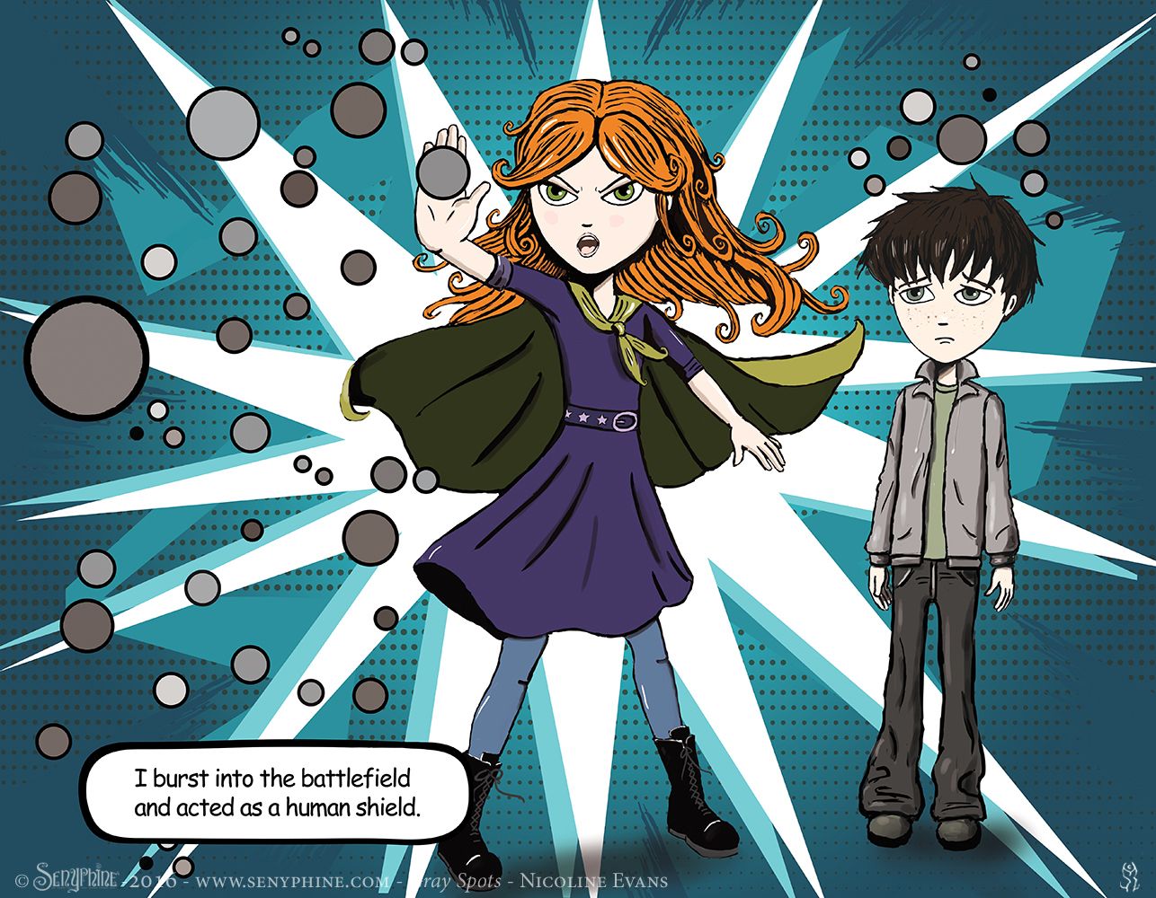 Résumé : Dans ce livre, les peurs sont représentées par des pois gris au-dessus des têtes des personnages. Plus un personnage a de pois autours de lui et plus il est tétanisé par ces peurs qui l'empêchent d'avancer. Cette histoire nous aide à trouver la force de nous battre contre nos peurs mais aussi contre l'injustice.  L'auteure nous rappelle qu'un peu de courage peut faire toute la différence. Le Livre aborde également la question de l'intimidation comme le harcèlement à l'école. Il donne des conseils aux lecteurs (de tous âges) pour se sortir de cette situation et l'encourage aussi à aider les autres.